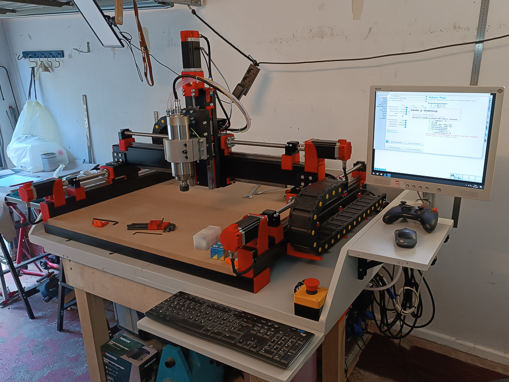 Später dann der Wechsel in die Garage und Rechteckrohre gesägt und lackiert, Löcher gebohrt und Gewinde geschnitten, Rahmen verschraubt, die ersten 3D-Druckteile hinzugefügt und langsam formte sich das Bild. Kugelumlaufspindeln, Schleppketten und Schrittmotoren montiert und alles verkabelt. Ach so, und noch die Wasserkühlung für die Spindel verbaut.