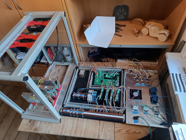 … dazu wurden natürlich noch hunderte anderer Teile wie Schaltnetzteile, Hutschienen, Sicherungsautomaten, Rundsteckverbinder, Schwerlastrollen, X-Box Controller, Lüfter, Linearführungsschienen, Koppelrelais, T-Nut Schienen benötigt …
