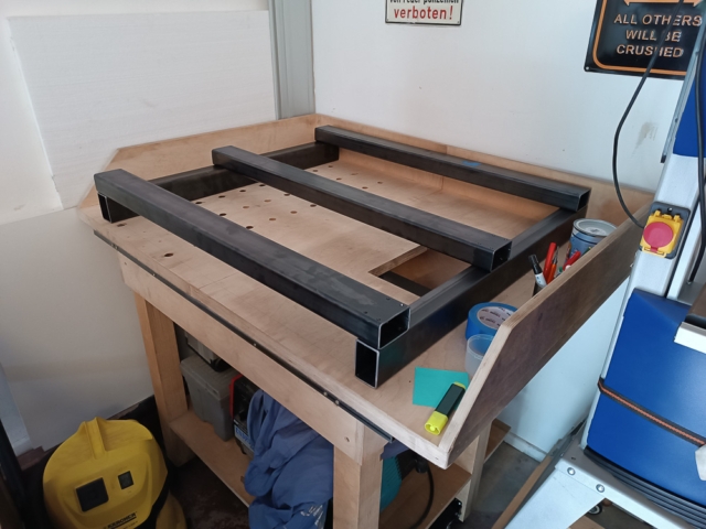 Später dann der Wechsel in die Garage und Rechteckrohre gesägt und lackiert, Löcher gebohrt und Gewinde geschnitten, Rahmen verschraubt, die ersten 3D-Druckteile hinzugefügt und langsam formte sich das Bild. Kugelumlaufspindeln, Schleppketten und Schrittmotoren montiert und alles verkabelt. Ach so, und noch die Wasserkühlung für die Spindel verbaut.